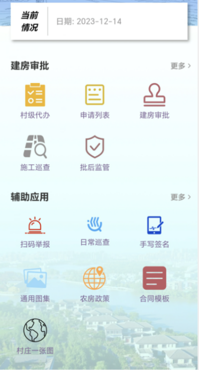 2 基于移动端的审批监管应用(如图2)。开发完成了村级代办、申请列表、建房审批、施工巡查、批后监管、通用图集、举报反馈、合同模板、农房政策、村庄一张图、手写签名、日常巡查等功能模块。利用统一的移动办公平台APP(山东通、青宅通),实现基层移动审批和三到场监管功能。