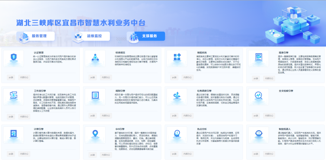 运用大数据分析、机器学习、遥感解译、水利模型、虚拟现实等技术方法,建设完成创新优化协调的“2+8”智能应用。“2”是指水旱灾害防御、水资源管理,“8”是指水利工程管理、河湖保护、水政监察、农村供水、水土保持、三峡后续项目管理、三峡水库安全管理及智慧水利一张图等智能应用,通过“2+8”智能应用的建设全面提升水利业务的精细管理、预测预报、分析评价与决策支持能力,为“水利工程补短板、水利行业强监管”的水利发展新思路提供信息化应用支撑。系统如图6-图14所示。