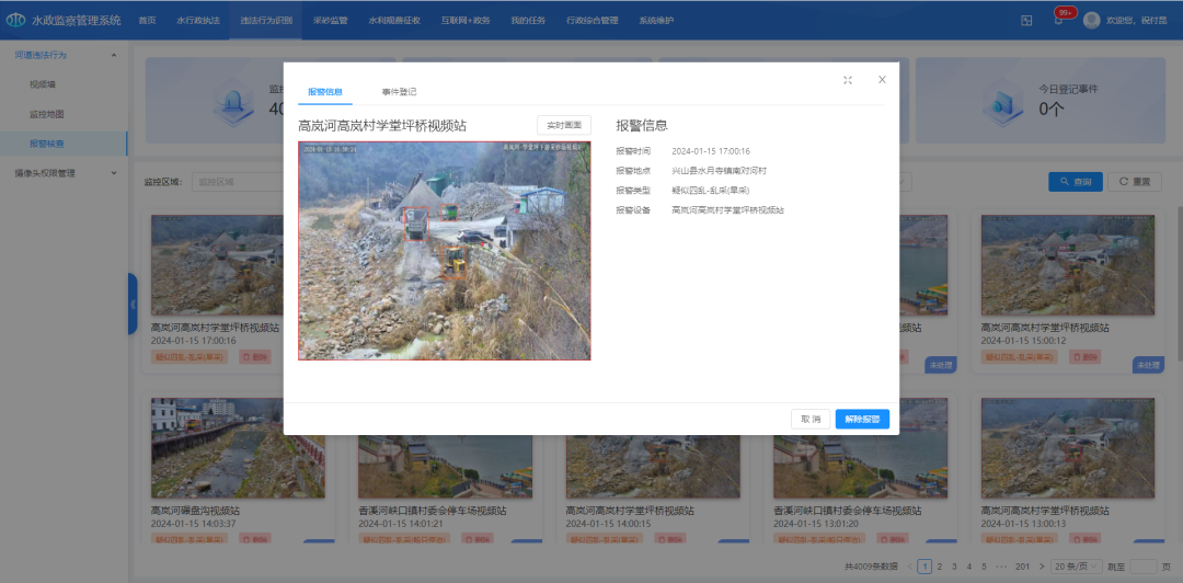 采用中心计算方式,充分利用视频AI技术,对水利工程管理、河湖综合保护、水政监察等业务系统中的水利工程施工现场违规行为、河湖“四乱”、非法采砂等问题实现AI自动识别预警,短信通知管理人员,系统交互反馈,实现事件闭环。