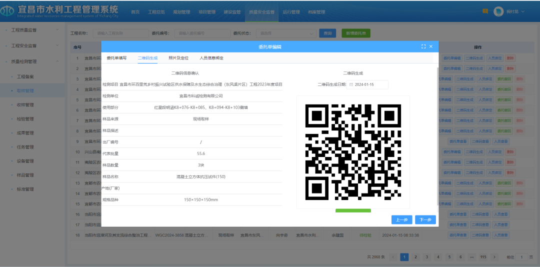 实现水利工程项目监管的“图上看、网上管、地上查”的管理模式。结合水利工程建设管理工作实际,建设“一码到底”的管理模式,通过扫描二维码标识,锁定检测过程全部参与人员,督促取送样、见证和检查人员履职,规范检测资料,同时绑定取样、见证、检测各环节的责任人,实现后期可追溯,建设监管、质量监督、运行管理、工程评价的全生命周期管理体系。