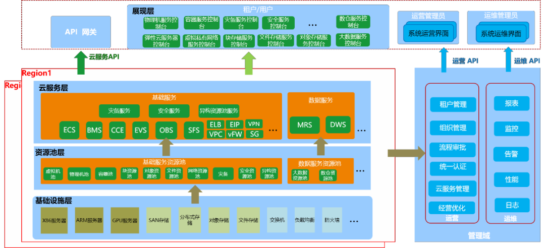 展现层:展现层是云管理平台的对外呈现,分为用户门户及管理员门户。用户门户面向最终租户/用户,管理员门户面向系统运营/运维管理员等。租户/用户可通过服务控制台自助实现对服务的申请、使用、监控、删除等生命周期管理的操作。运营/运维管理员可以通过管理员门户完成对系统的管理。