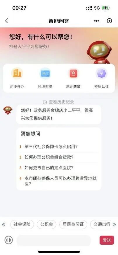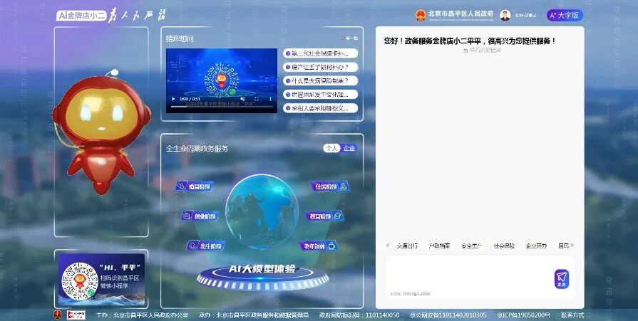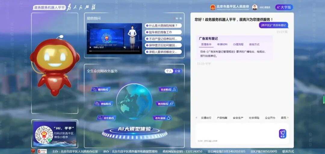 “平平”是昌平区首个对外投入使用的全政务领域政务咨询AI机器人,功能目标设定为:政务服务领域问题做到“有问必答”助力企业、群众网上办事像网购一样简单。