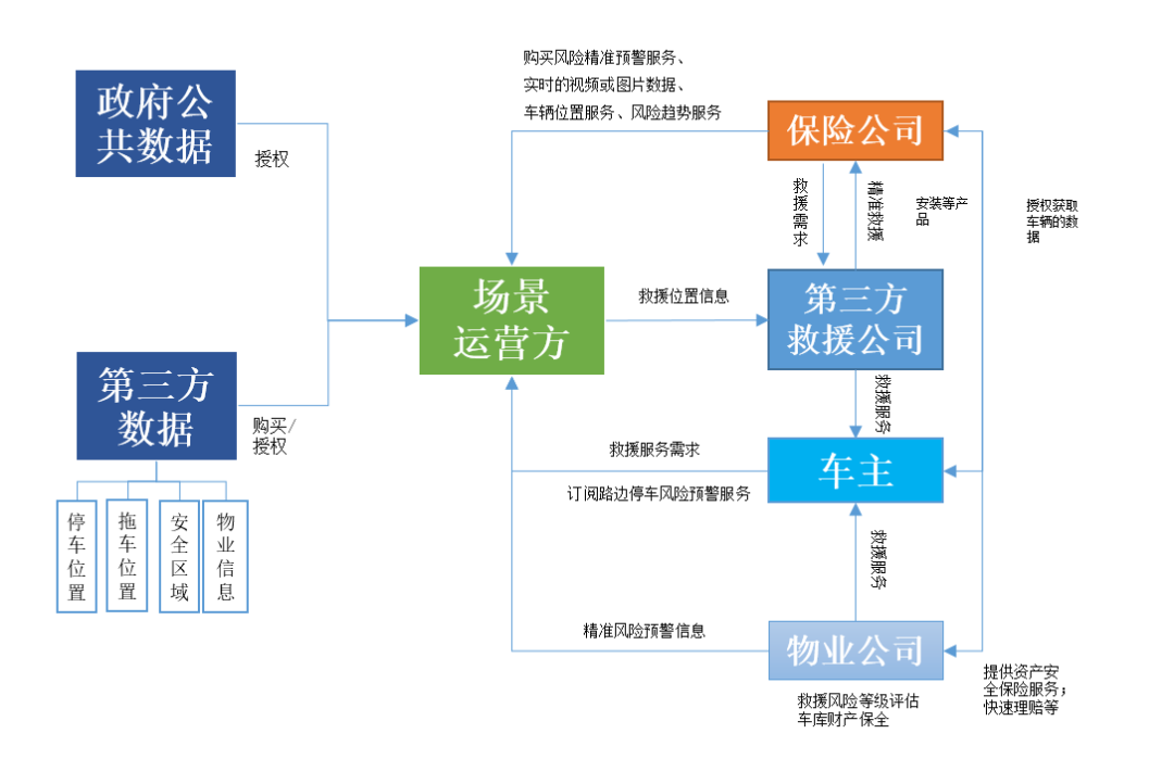 停车场、物业、救援等第三方平台:一是汇聚这些平台和车辆涉水预警和救援及理赔佐证场景相关的车辆进出数据、视频数据等,二是在商业运营场景做作为救援辅助平台,接收运营平台调度指令,共同开展预警救援业务。