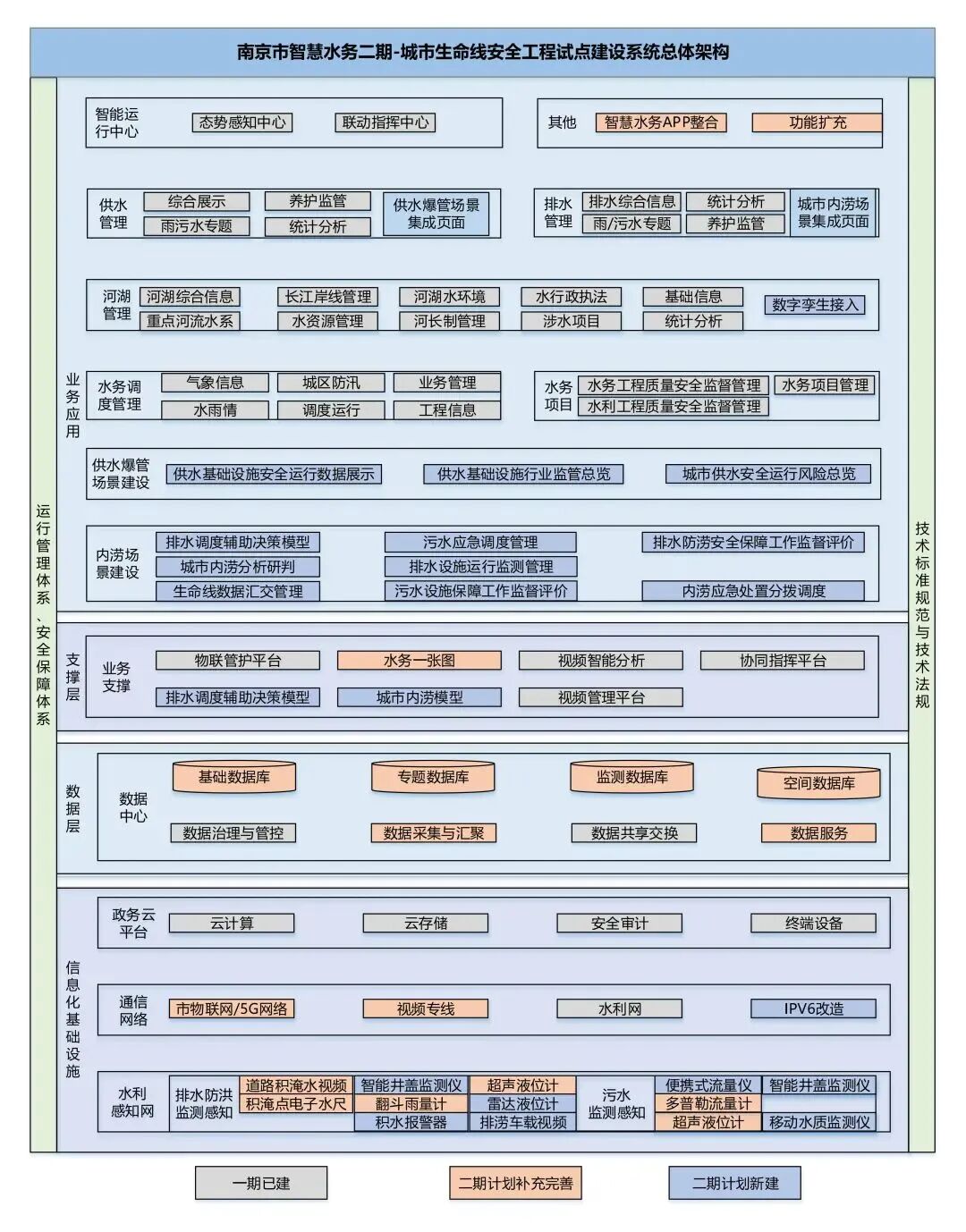 南京智慧水务建设项目(2020-2021年度)于2020年10月正式开工建设,2021年10月完工,通过一期项目建设,初步建成“一网、一图、两中心、四平台、五+N应用”的南京智慧水务总体架构,智慧水务二期项目(2023-2024年度),在一期建立的总体架构体系下,基于南京市智慧水务平台现有架构、信息化资源扩展,进一步补充完善感知体系、根据业务工作需要升级补充业务系统功能,并根据需要对应用支撑平台、数据中心等进行适当补充。
