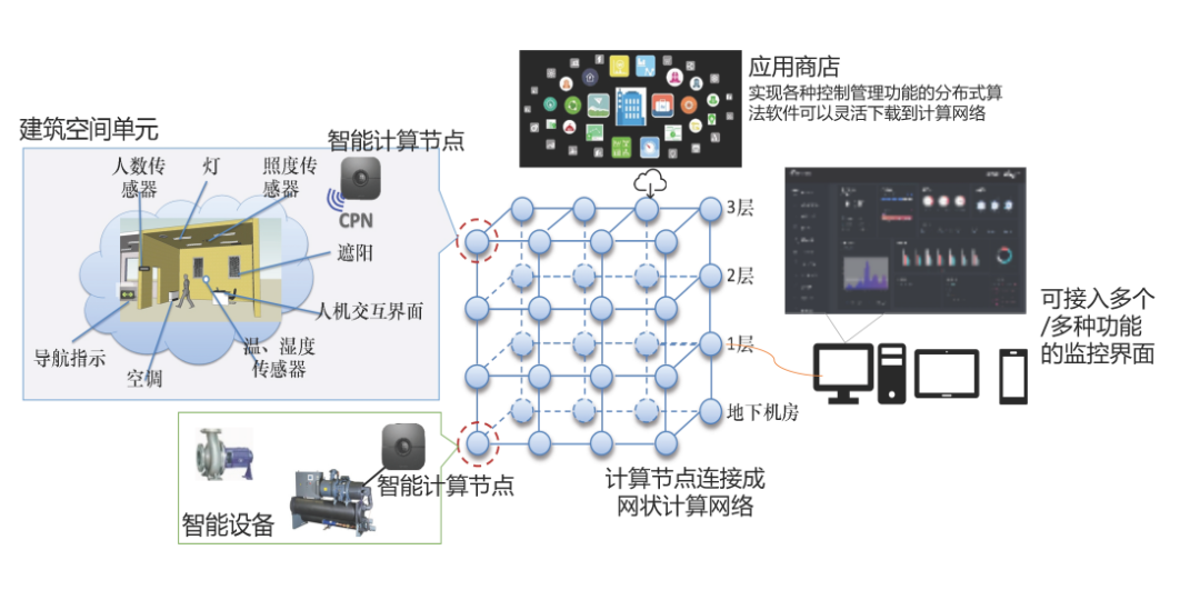 项目最核心的创新是用群智能分布式架构取代了传统的集中式控制架构。传统系统依赖中央主机,而群智能系统将智能赋予每一个CPN节点。每个节点内置标准化单元模型和分布式算法,通过节点间自组织的相互协作,以“群体智能”的方式实现全局优化。这种架构如同为建筑安装了“自主神经系统”,实现了信息技术与物理系统的天然融合,兼具了人工智能、物联网、边缘计算等技术的优势,解决了中心化系统固有的响应迟滞、单点故障、扩展困难等问题。