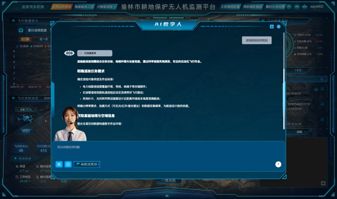 集成智能问答、数据统计分析、AI航线规划三大功能,构建“数据解读-疑问解答-路径规划”全流程智能支撑体系。智能问答模块依托知识库实时响应业务疑问;数据统计分析模块整合全量巡检数据,多维度拆解并可视化呈现;AI航线规划模块结合巡检需求、场景特点及资源配置,生成最优巡检路径,兼顾覆盖全面性与执行高效性,提供端到端智能服务。如图6所示。