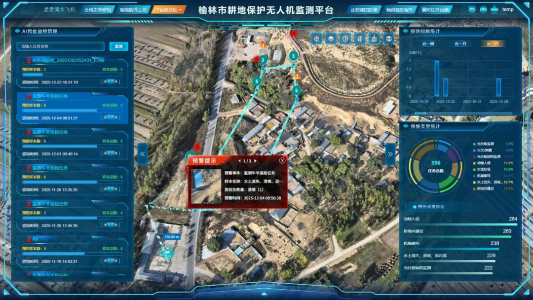 以“早发现、早制止、早查处”为目标,以永久基本农田和耕地保护红线为电子围栏,无人机按智能航线巡航,不定时采集影像数据。平台垂直大模型自动识别动物入侵、违规建设、机械破坏等行为,锁定异常点位并生成预警,通过耕保通APP推送至执法人员,实现“预警-派发-核查-反馈-归档”4小时闭环处置。