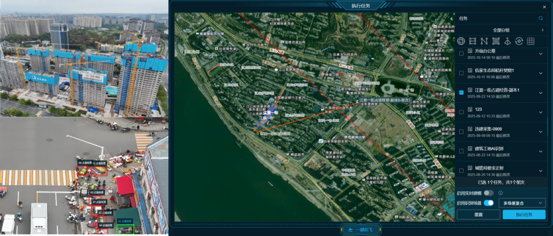 针对政务巡检“任务多、目标杂、场景差异大”的特点,构建动态多任务AI检测机制,实现“一次起飞、多项识别”。无人机在同一架次飞行中,可同时对禁捕禁钓人员与船只、施工变化与占道经营问题进行并行识别,如图4所示。避免传统模式中“一个任务一趟飞”的低效运行。