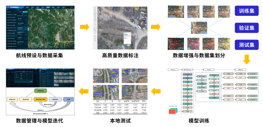 建立“采集—标注—训练—增强—训练—测试—迭代”的机制,如图6所示。将人工智能深度融入低空巡检全过程。无人机巡检获取的数据自动入库,经人工抽检与标注后持续反哺模型训练,实现算法能力随业务运行不断优化升级。依托真实治理场景开展持续数据迭代,目前已围绕水域监管、生态保护和农村治理等领域完成模型版本迭代10余次,重点场景识别准确率由初期约70%提升至85%以上,有效解决通用模型与本地复杂环境适配不足的问题,实现从“人工识别为主”向“AI辅助决策”为主的转变。