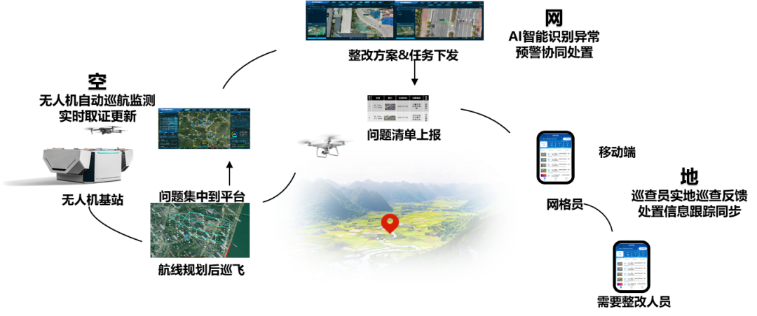 联合公安、园林、应急、农业等部门统筹推进,成立专业低空运营团队进行具体实施。围绕重点水域、事故易发区域和学生集中活动区域,开展常态化空中巡查,通过平台统一汇聚巡检数据,并按业务归口推送至相关部门,实现问题发现、预警提醒和现场处置的联动衔接,如图3所示。在运行模式上,采用政府购买服务方式,提供飞行巡检、数据处理和智能分析服务,有效缓解基层监管力量不足问题。