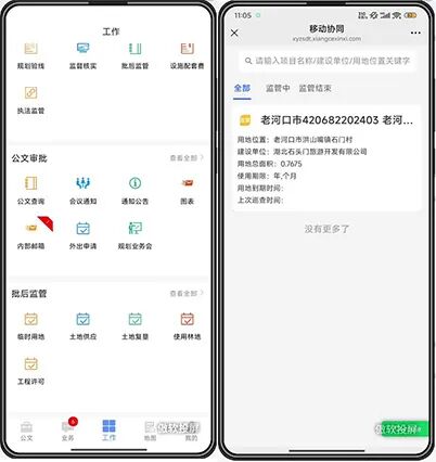 完善土地供应、临时用地、临时用地占用林地、土地复垦、工程规划许可等批后监管事项,增加外业核查移动办公模块,监管人员可现场巡查、现场填报、对项目实施情况进行现场拍照并上传,发现违建行为。