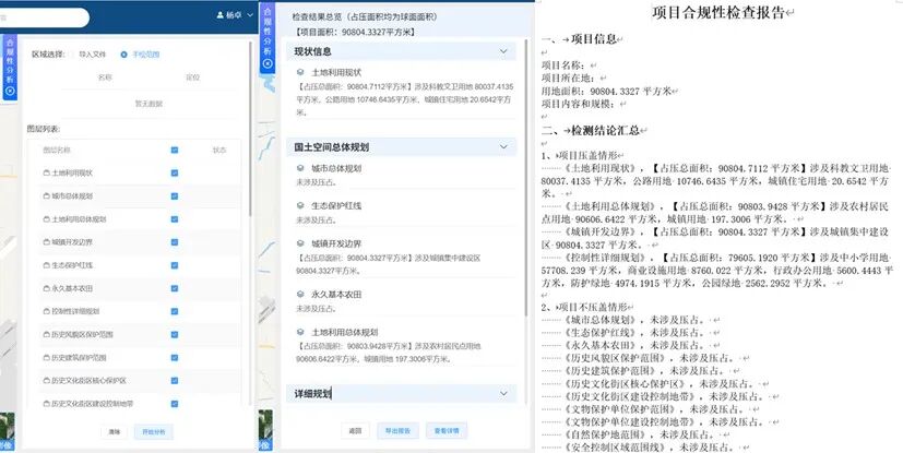 穿透查询可动态配置分析图层,扩展叠加现状、国土空间规划、详细规划、专项规划等数据,开展项目用地范围的合规性检查。对审查结果及审查报告的信息进行归类,突出显示是否压占、压占面积等重点分析结果。