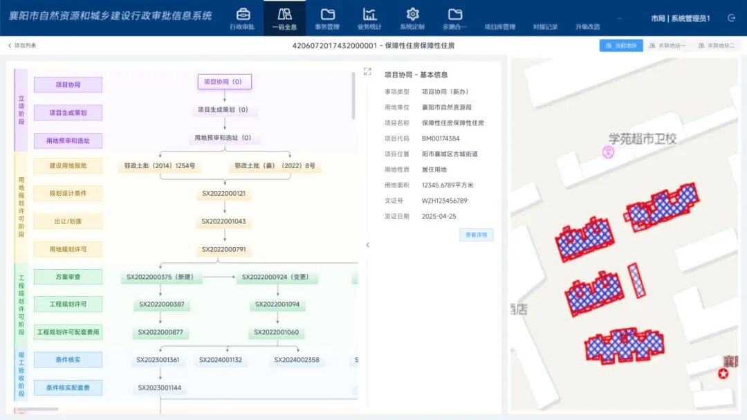 项目以地块作为核心管理单元,优化重组用地全流程项目树,破解地块与项目关联不清的痛点问题;串联批地、用地审批、工程建设到不动产登记的完整业务链条,实现土地管理全流程闭环管理;依托项目树实现“一码”归集全流程信息,为上下游材料继承、表单自动填写奠定基础。