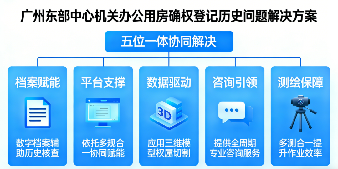 为解决广州东部中心机关办公用房确权登记历史问题,项目搭建了“档案赋能+平台支撑+数据驱动+咨询引领+测绘保障”五位一体协同解决方案(如图1)。