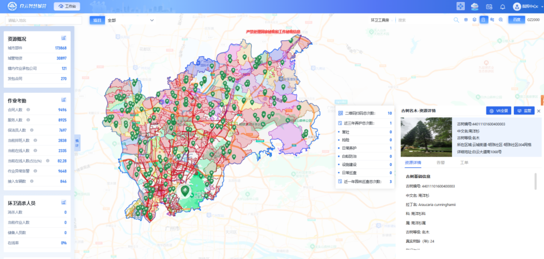一是建设智慧城管。综合运用物联感知、人工智能、大数据、云计算等新一代信息技术能力,建成集感知、分析、服务、指挥、监察于一体的白云智慧城管系统,城市管理从传统依靠人力治理走向一体化智能运作。二是打破数据壁垒。汇聚区政数、公安、规自、市场等部门城市治理相关数据,建立统一数据标准和规范,实现数据集中管理、分析、共享,形成用数据说话、数据决策、数据管理、数据创新的管理机制。三是实现一网统管。将燃气站点、垃圾收集点等17.38万个城市部件,环卫作业车、AI巡逻车等3.08万余个重要城管物资,以及近万名城市管理服务人员全部录入城市CIM底座,有效解决以往城市管理要素繁杂、底数不清、缺乏统筹等问题。