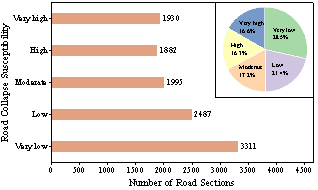 提出了城市地面塌陷风险智能评估与分级分类模型框架。该框架创新性地引入极端梯度提升人工智能算法(XGBoost),系统挖掘地质条件、管线分布、交通荷载、气象要素等多源风险因子与地面塌陷隐患之间的复杂非线性关联与映射机制。在建模过程中,通过引入正则化约束、二阶导数优化及特征列子采样等先进技术,对传统梯度提升决策树进行了重要改进,有效增强了模型的泛化能力与预测精度,同时显著提升了训练效率与大规模数据的处理能力。在此基础上,采用詹克斯自然断点法,依据最小化类内方差与最大化类间差异的统计原则,将连续型风险指数科学划分为五个等级(极高、高、中等、低、极低),实现了风险水平的客观分级与有效可视化。该人工智能驱动的模型框架突破了传统方法在高维非线性关系识别和异构数据融合方面的局限,为城市道路塌陷的风险精准识别、分级防控和科学决策提供了可靠的技术支撑。上海市中心城区道路塌陷隐患图如图6,上海市中心城区道路塌陷隐患等级统计图如图7。