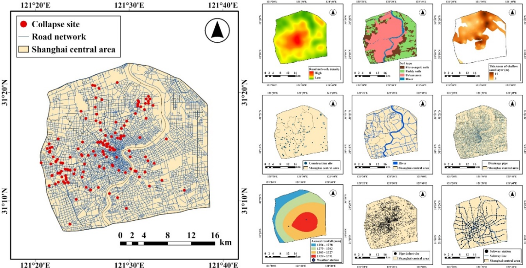 首次系统提出了城市道路塌陷包含自然和人为的多要素风险因子集,涵盖道路属性、地质条件、地下管线及周边环境四大类共十六项风险因子,如表1,上海市道路地面塌陷多源异构隐患因子可视化结果如图5,该因子集突破了传统研究中因子单一、维度局限的片面性。