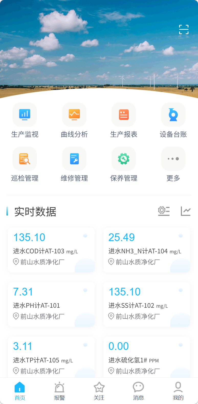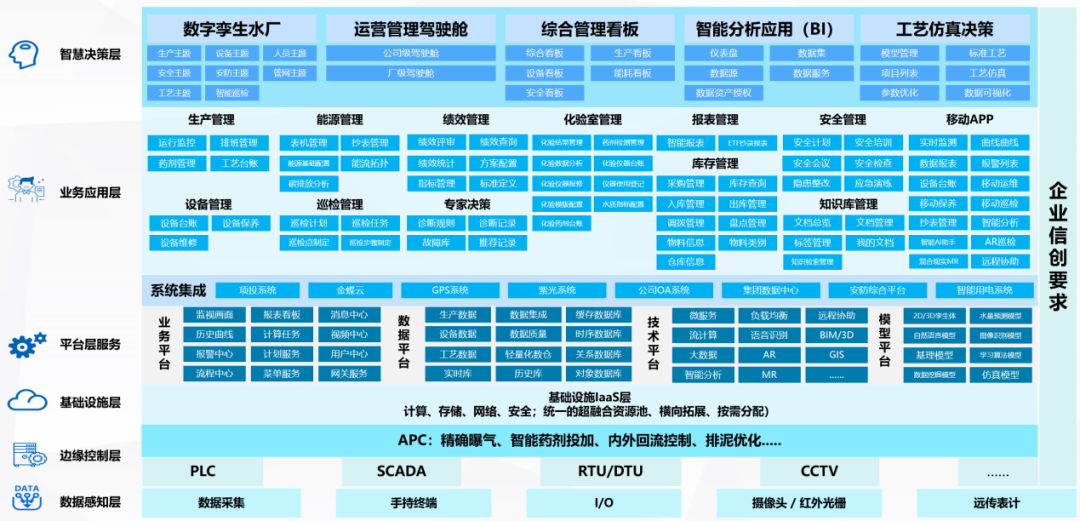 集约化整合现有自控系统 PLC 数据、流量 / 水质 / 泥位等仪表数据,以及视频监控、门禁、设备状态监测等感知信息,实现生产关键数据实时采集。