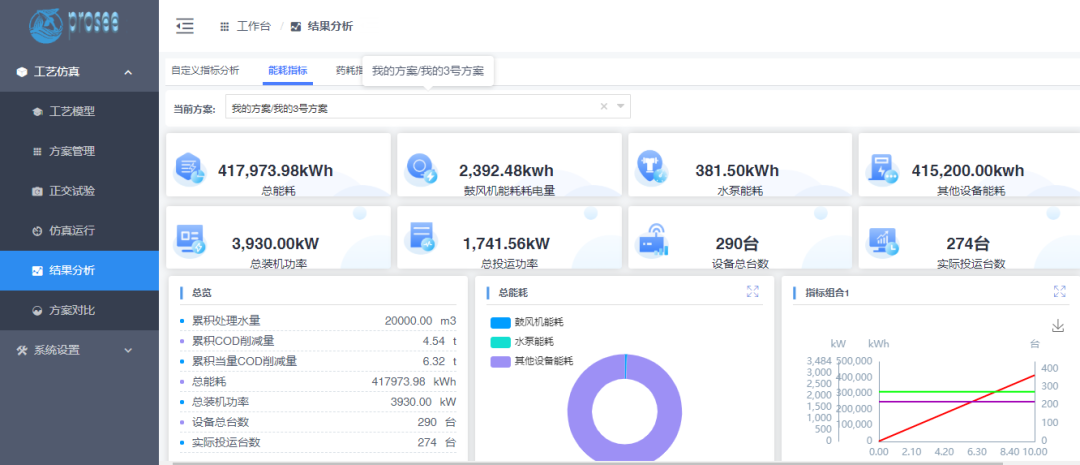 通过智能配电系统与药耗监测模块,实现能耗、药耗的精细化实时监控与动态分析,结合生产工况优化资源调配,在保障出水水质稳定达标的前提下,实现资源消耗最小化,提升资源利用效率。能耗药耗仿真界面如图6所示。