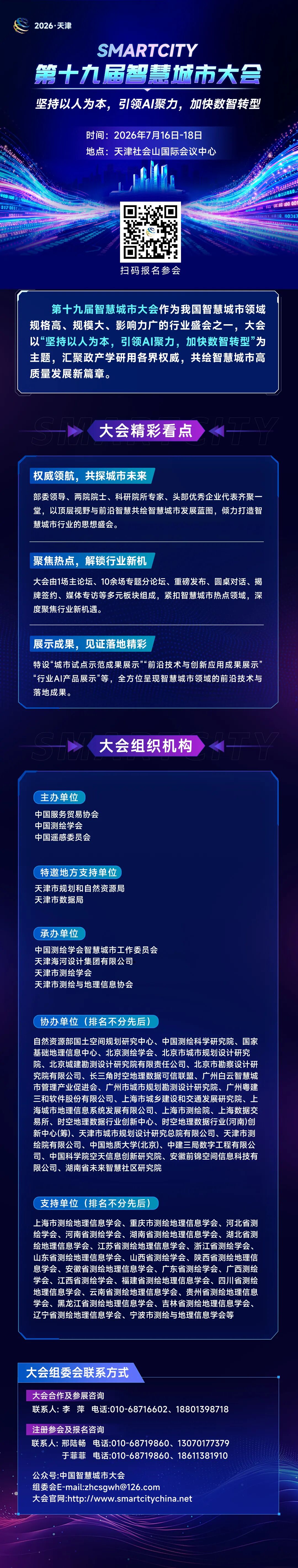 今年,第十九届智慧城市大会即将在天津隆重举办。恰逢大会创办二十五周年,我们期望本届大会能进一步推动测绘地理信息与智慧城市的深度融合,为城市高质量发展注入更强劲的动能。